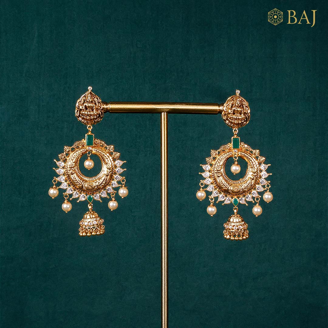 These 22kt antique kundan jewellery earrings feature a classic crescent silhouette with pearl hangings, green stone accents, and finely detailed domes. With a heritage-inspired design and vintage finish, they are ideal for festive dressing, bridal looks, or collectors of traditional Indian artistry.