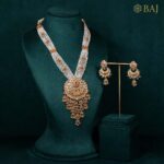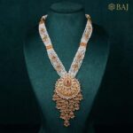 This 22kt kundan long necklace features layered pearl strands with intricately detailed gold connectors and a grand pendant adorned with ruby and polki work. Perfect for weddings and traditional ceremonies, this piece captures regal heritage and timeless bridal elegance in every element.
