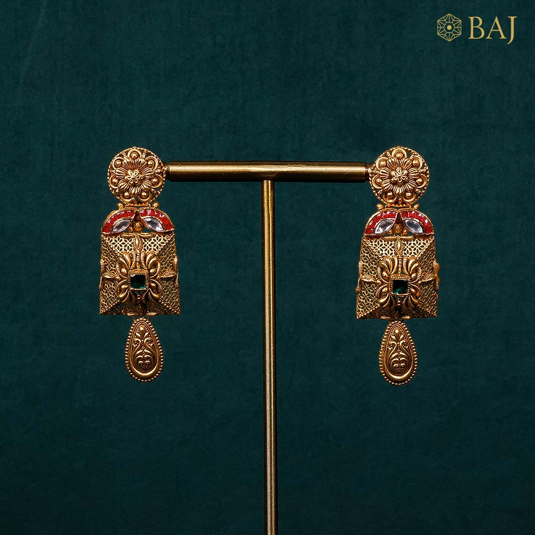 An exquisite piece of antique kundan jewellery, this 22kt gold choker features traditional temple motifs, red-green enamel work, and intricately carved drop charms. The bold matching earrings enhance its heirloom feel — a timeless design perfect for brides and cultural festivities steeped in tradition.