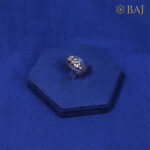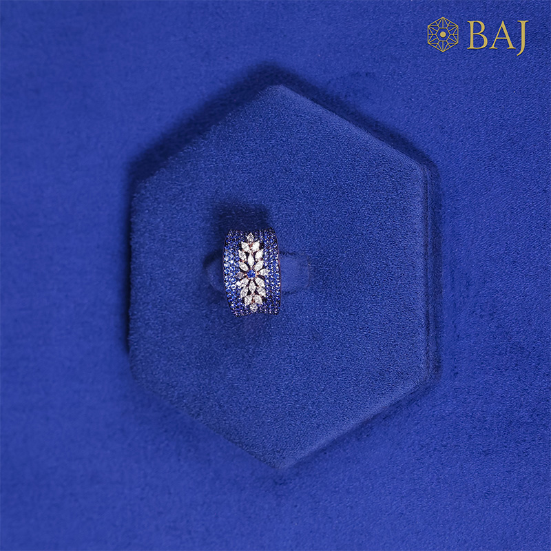 Gracefully adorned with vibrant blue stones, this exquisite band features a unique horizontal flower design crafted from marquise-shaped stones. At the heart of the flower sits a tiny blue stone, adding a subtle yet captivating focal point. The harmonious blend of shapes and colors creates a serene and elegant piece that celebrates nature’s beauty with a touch of refined sparkle.