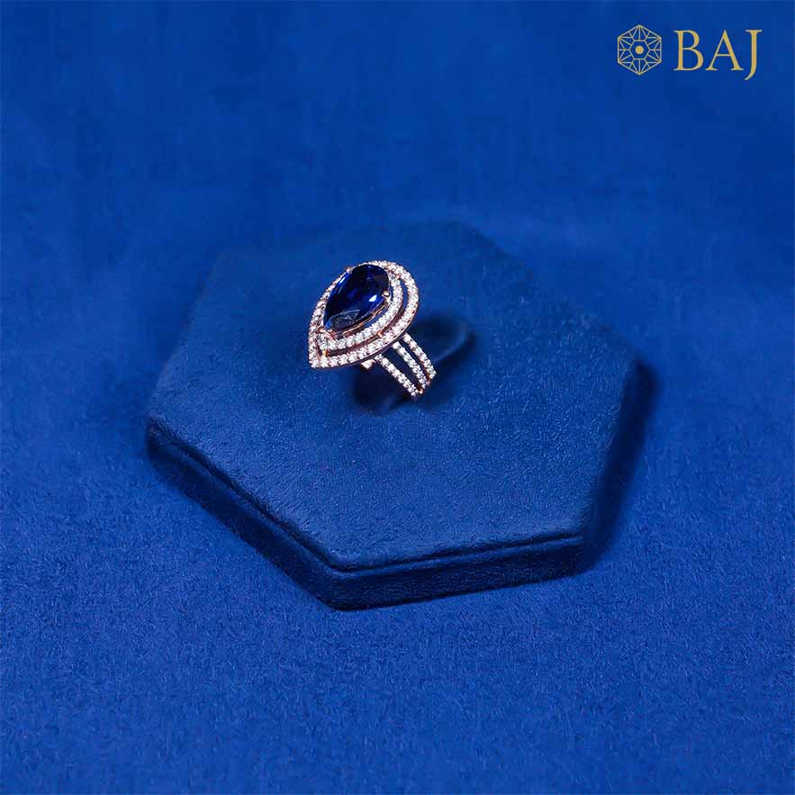 Commanding attention with its bold design, this ring showcases a magnificent pear-shaped colored gemstone at its center, radiating vibrant color and sophisticated allure. Encircling the gemstone are two delicate lines of small, shimmering diamonds that frame the stone beautifully, adding layers of brilliance and enhancing its captivating shape.
