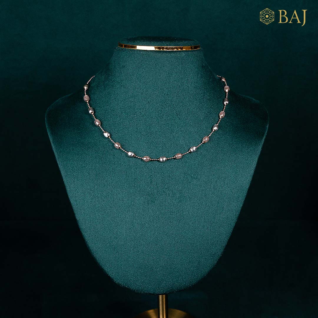 Crafted in 18kt gold with glimmering textured beads, this chain is a perfect pick for standout gold chains for women. Lightweight yet luxe, the blush-tone detailing adds subtle charm to your neckline. Whether worn solo or paired with a pendant, it’s a modern essential that blends everyday ease with graceful beauty.