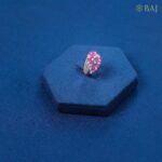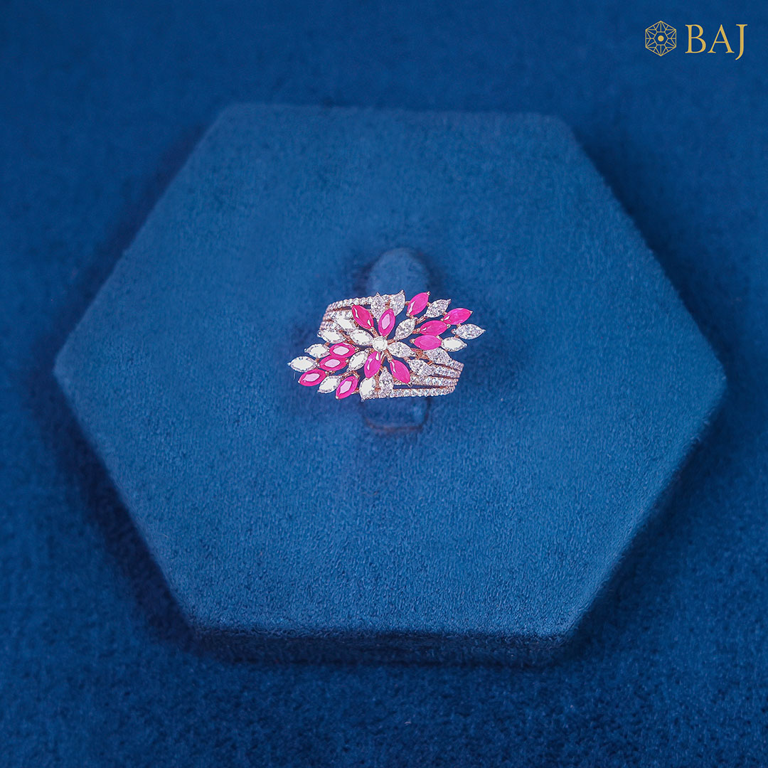 Cluster of pink ruby marquise and sparkling white marquise diamond gleams on a thick band of line diamonds