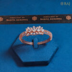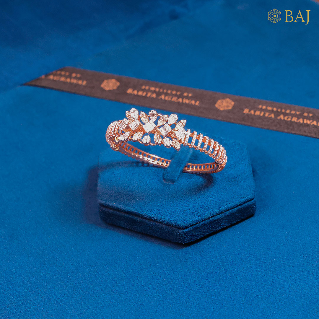 It’s a beautifully crafted baguette setting design with arcs of round diamonds bracelet kada in rose gold.