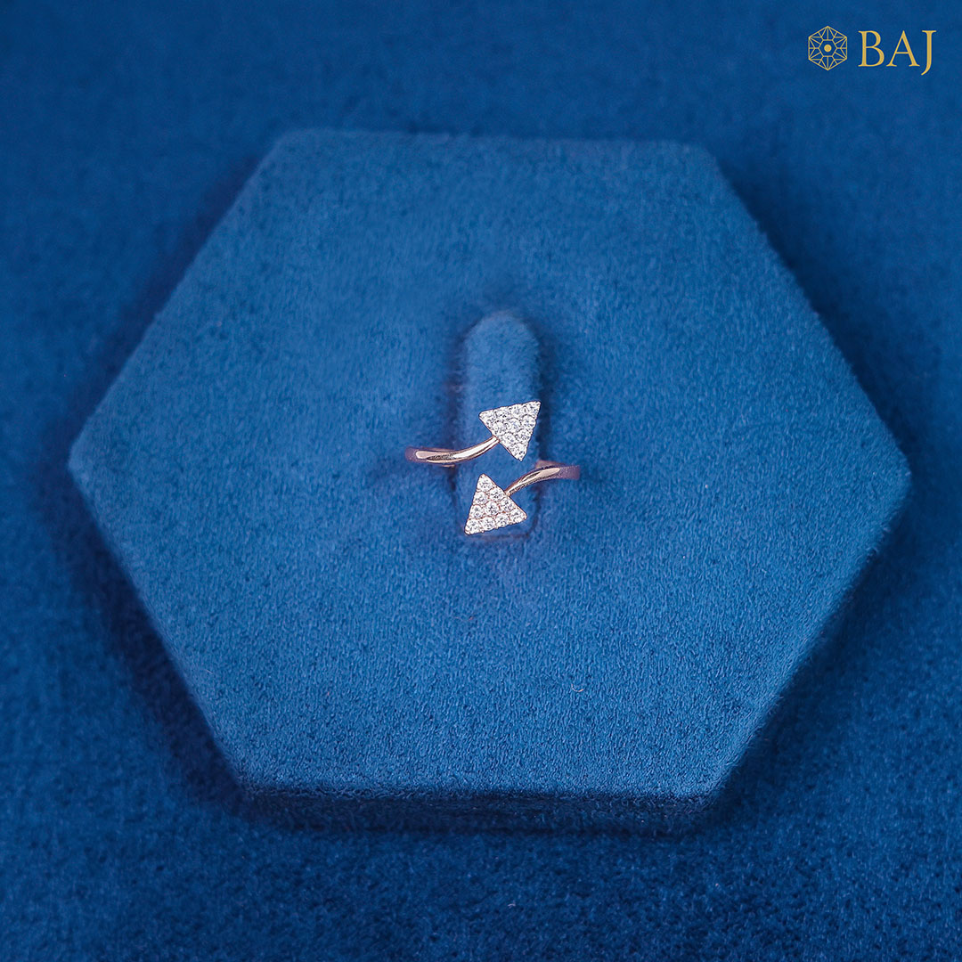 Modern sophistication meets timeless sparkle in this captivating ring. Two petite triangles, each filled with shimmering diamonds, face each other in perfect symmetry—symbolizing balance, connection, and strength. Set in warm, lustrous rose gold, the geometric forms create a striking contrast that blends contemporary design with classic elegance.