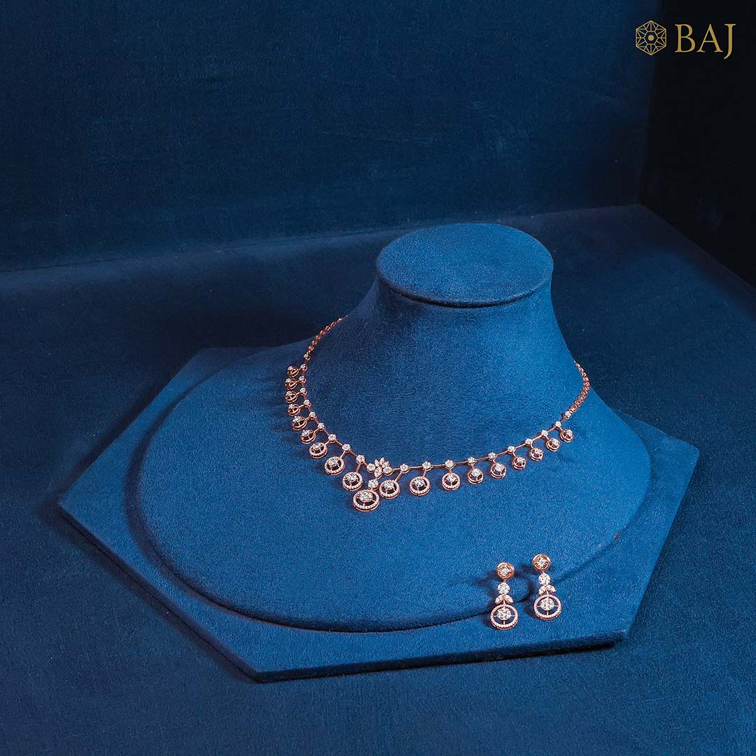 Gracefully crafted in 18kt gold and adorned with 3.09 carats of natural diamonds, this elegant piece is a timeless diamond necklace set for bride. Its circular diamond detailing and lightweight structure make it ideal for bridal functions or intimate celebrations, offering classic sparkle with modern finesse.