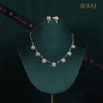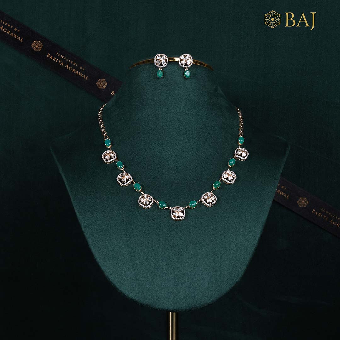 A delicate polki diamond necklace crafted in 14kt gold with alternating emerald beads and uncut diamond clusters. Lightweight yet impactful, this design is perfect for intimate celebrations or gifting. Matched with minimal polki earrings for a refined festive charm.