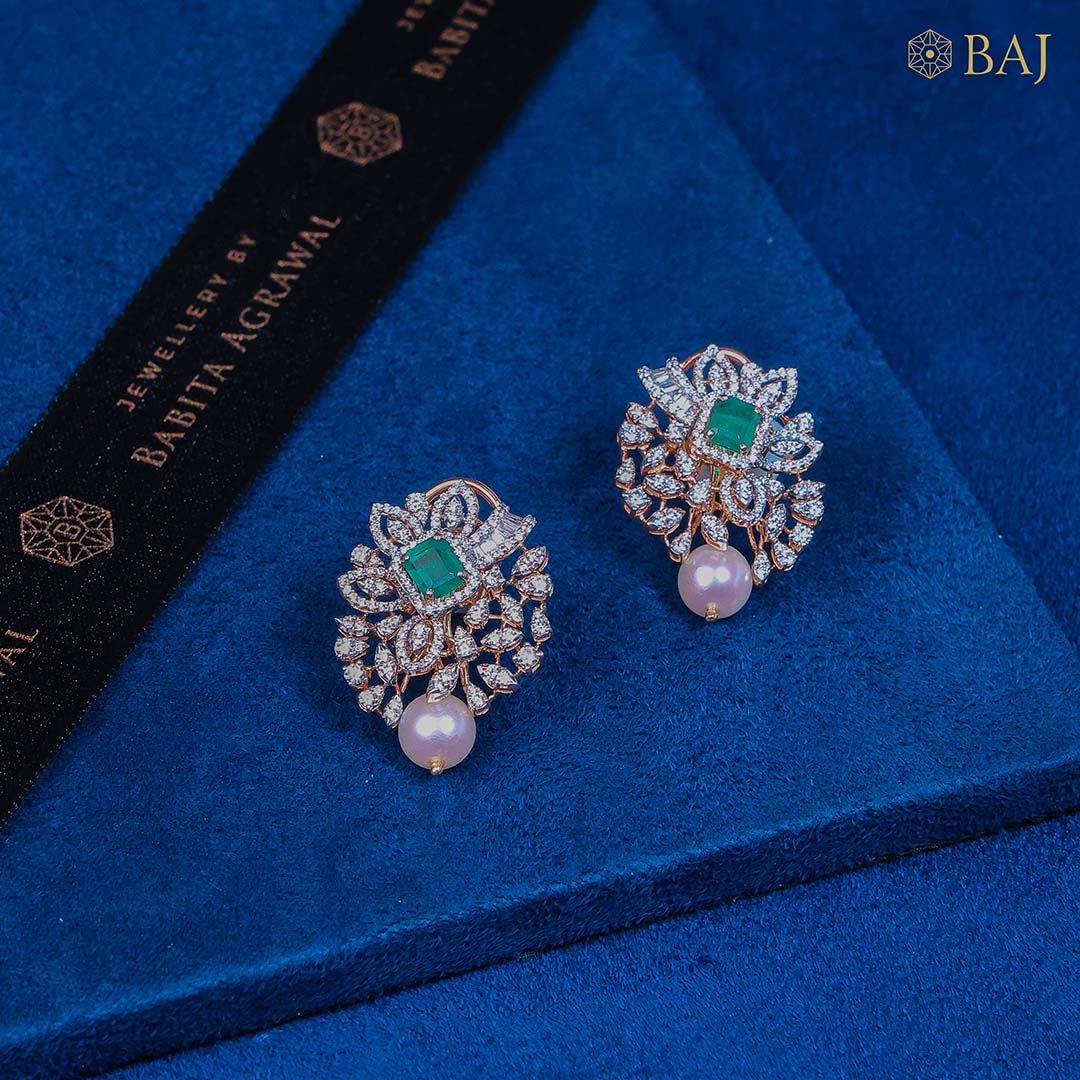 Make a royal statement with this luxurious diamond stud earring, crafted in 18kt gold. Adorned with an emerald centerpiece, surrounded by dazzling diamonds and finished with a delicate pearl drop, this earring blends grace with grandeur—perfect for cocktail occasions where your diamond stud earring should shine brightest.