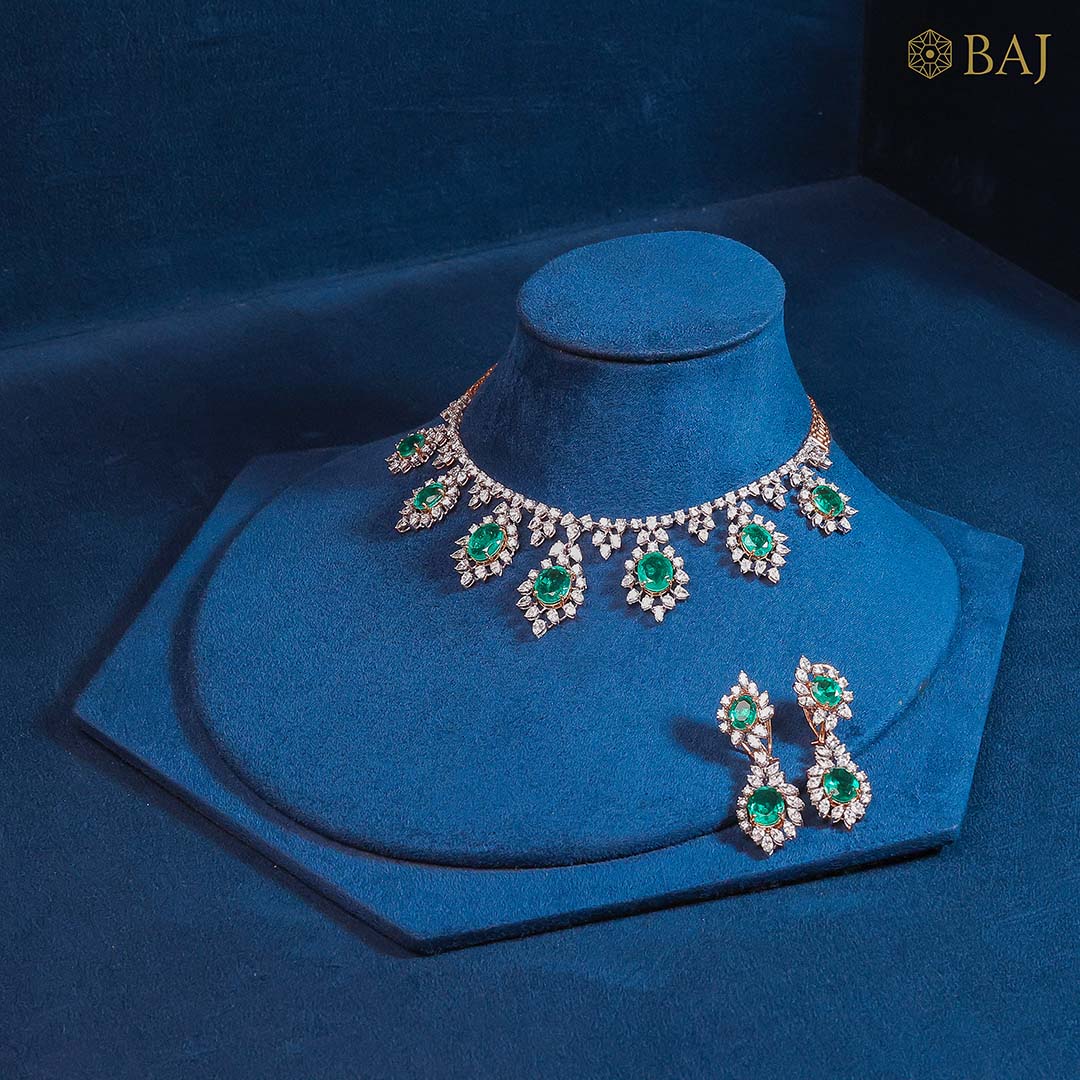 Statement luxury with a bold diamond necklace for women, adorned with vibrant emeralds and designed to elevate bridal and evening looks.