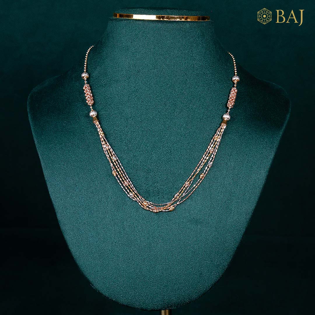 Crafted in 22kt gold, this layered chain features delicately twisted strands with polished bead accents for a radiant yet refined look. A standout from our gold chains collection, it blends heritage elegance with contemporary design, ideal for festive events or elevating everyday ensembles with effortless charm. A timeless choice for modern women.