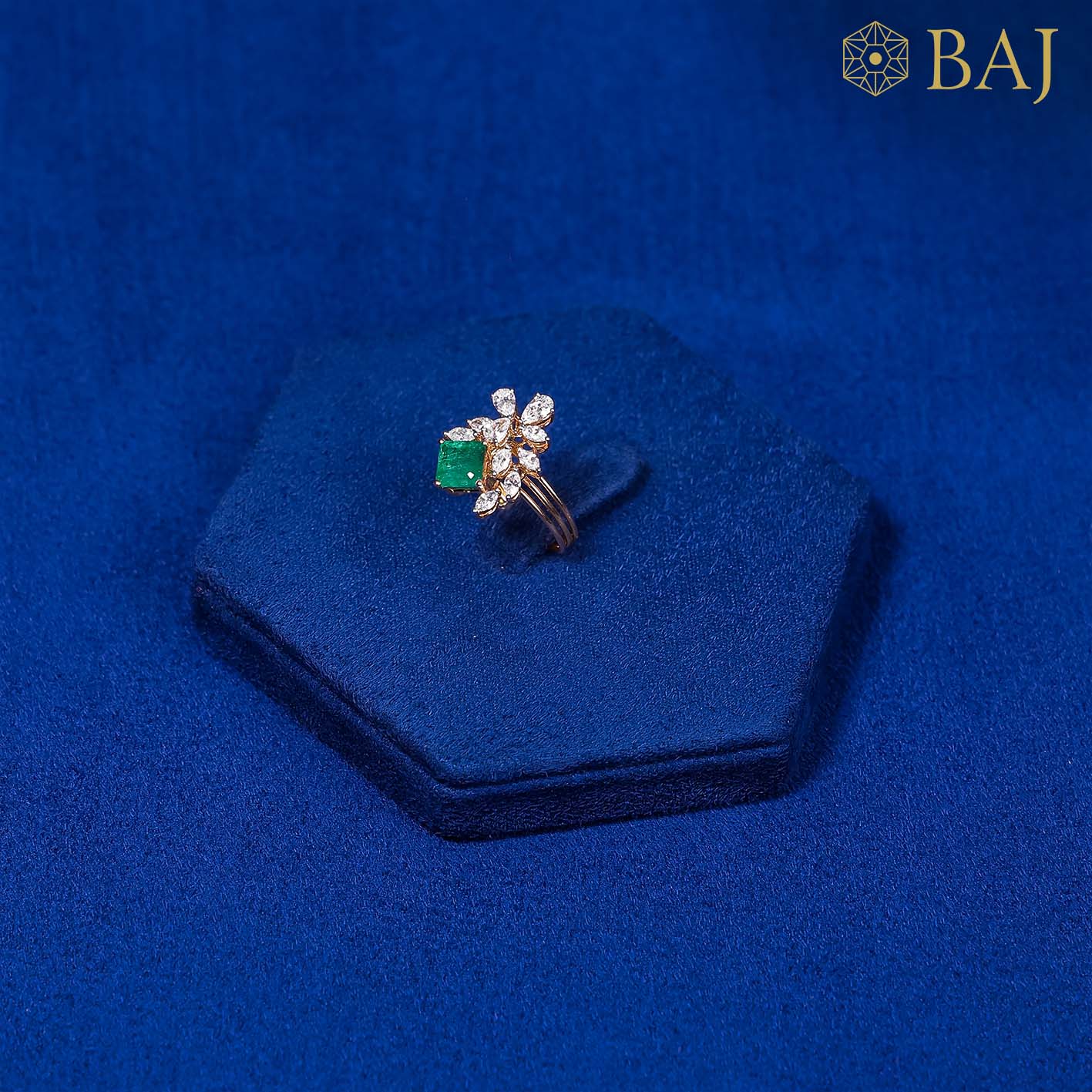 This exquisite ring artfully combines the elegance of marquise and pear-shaped diamonds arranged around a striking green square-shaped gemstone, creating a captivating contrast of shapes and colors. Anchoring the design are three sleek rose gold lines that form the band, adding warmth and modern sophistication. The harmonious blend of sparkling diamonds, vibrant green stone, and rose gold detailing makes this piece a timeless statement of refined beauty and contemporary style.