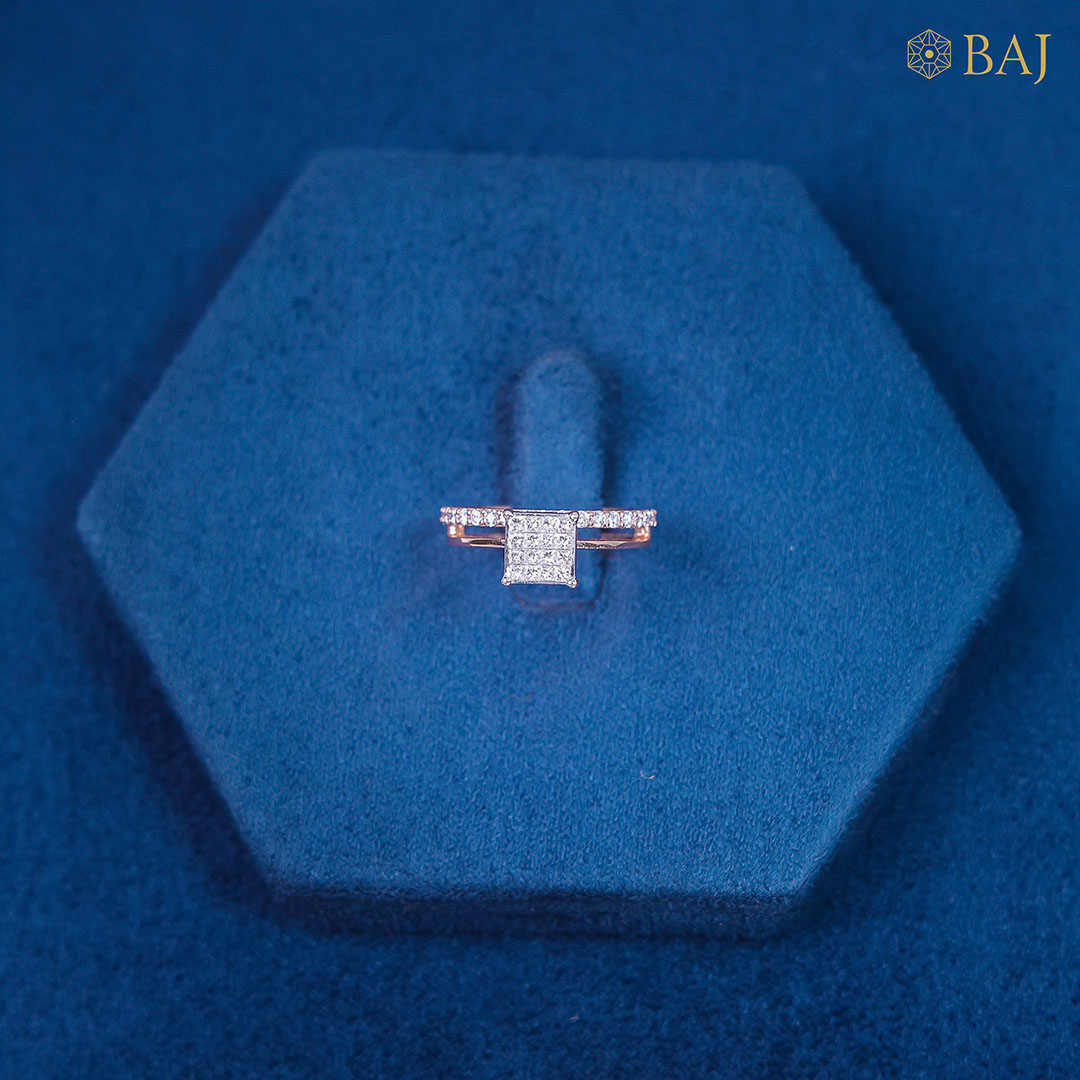 A perfect balance of contrast and sparkle, this two-band ring features one slender band delicately paved with diamonds, paired alongside a slightly thicker band for a modern layered look. At the top, a striking square princess-cut diamond cluster creates the illusion of a single, breathtaking gem, radiating brilliance from every angle. This design effortlessly combines contemporary style with timeless elegance, making it an eye-catching statement piece for any occasion.