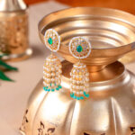 Jade Halo Pearl Jhumkas blend timeless grandeur with delicate artistry. These regal earrings showcase circular Polki-encrusted studs, each centering a luminous green gem, crowned with a halo of pearls. Suspended below are tiers of cascading pearl and emerald beads that catch light and motion. Crafted in 18K Fancy Gold, they radiate ethereal charm—perfect for bridal grandeur or festive allure.