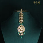 Make a majestic bridal statement with this bold polki bridal maang tikka, set in 18kt gold with green bead drops and dazzling diamonds. The structured design adds regal elegance to wedding-day attire, making it perfect for the bride seeking timeless tradition with a rich, heritage flair.