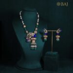 A majestic polki diamond necklace in 18kt gold, showcasing a sculpted peacock pendant adorned with jadau diamonds, enamel artistry, and pearl detailing. The statement silhouette and rich craftsmanship make it ideal for heavy bridal wear or ceremonial grandeur.