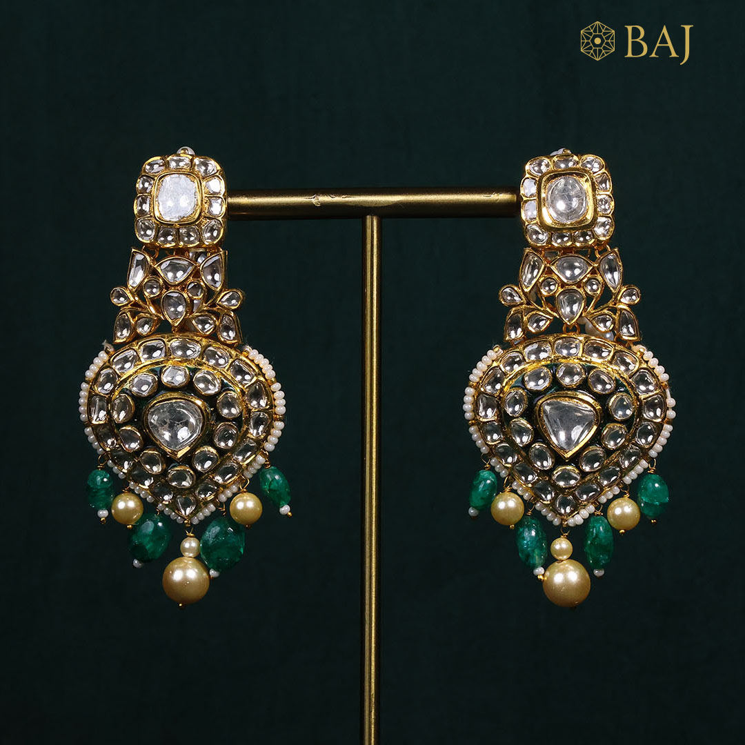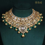 This opulent polki necklace set is crafted in 18kt gold with dazzling polki diamonds and rich green and golden drops. Designed for grand occasions, its layered grandeur and intricate detailing reflect unmatched royal elegance—perfect for brides and statement festive wear.