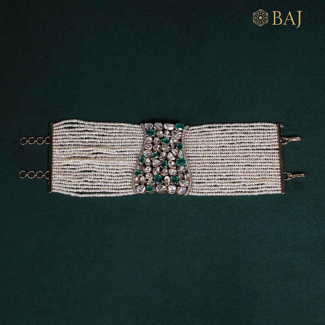 Make a statement with this grand polki bracelets diamond creation, featuring layers of micro pearls and a central burst of uncut diamonds and emeralds in 14kt gold. Ideal for brides and heritage occasions, this bracelet is a modern heirloom that speaks of legacy and artistry.