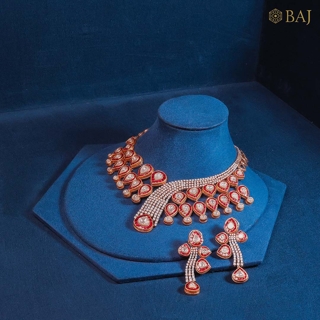 Drape yourself in regal elegance with this 18kt heavy wear diamond necklace set, encrusted with 21.37 carats of dazzling diamonds and vibrant red embellishments. A true showstopper, this grand diamond necklace set is designed for weddings, galas, and timeless celebrations.