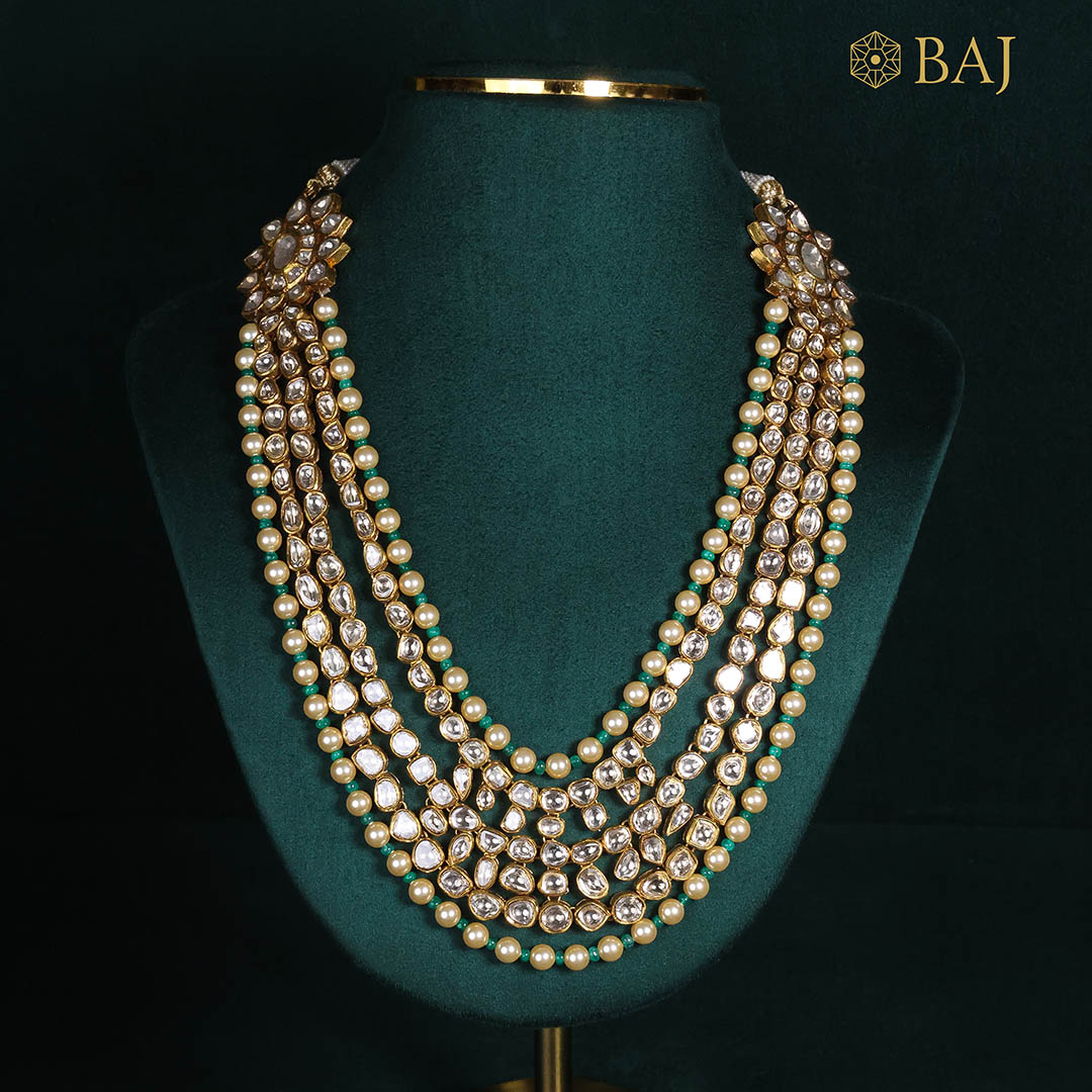Celebrate grandeur with this handcrafted polki diamond necklace, layered with uncut diamonds and pearls in 18kt gold. A regal blend of traditional artistry and opulence, this polki diamond necklace is ideal for weddings and special occasions. Elevate your ethnic look with this luxurious statement piece.