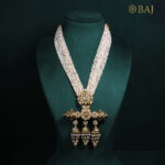 Make a statement with this opulent polki necklace set, featuring intricate uncut diamond work and grand temple-inspired drops. Accented with pearls and 18kt gold, it brings heritage craftsmanship to life. A luxurious choice for weddings and grand festivities, with coordinated earrings to complete the regal look.