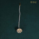 Grace your bridal look with this handcrafted bridal maang tikka, set in 18kt gold with uncut polki diamonds and delicate pearls. The classic dome motif evokes regal charm, while the pearl string adds elegance. An essential piece for Indian brides seeking timeless style on their big day.