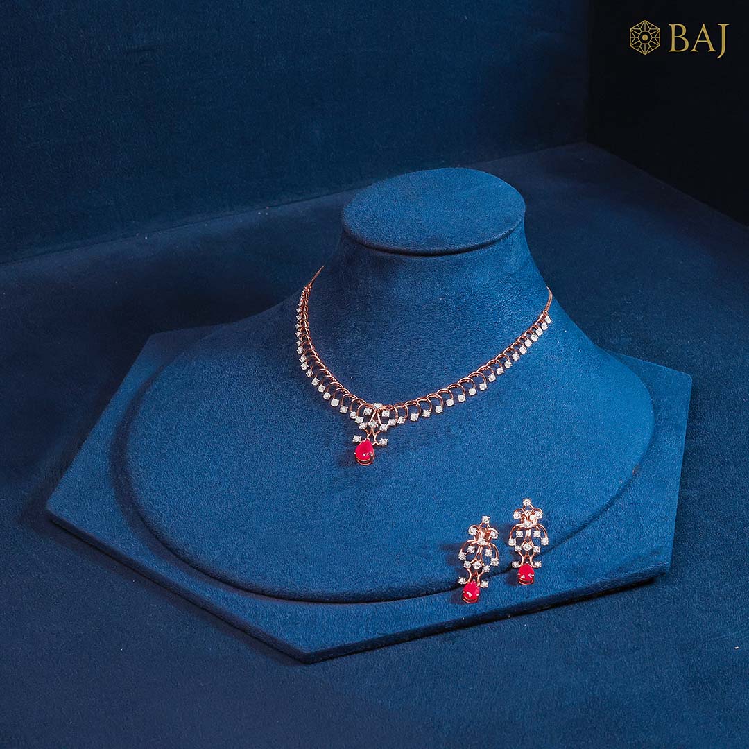 Add a bold touch to your bridal ensemble with this diamond necklace set for bride, featuring radiant red accents and 1.75 carats of certified diamonds. Crafted in 18kt gold, this lightweight set is ideal for pre-wedding functions or intimate ceremonies, delivering both elegance and grace.