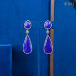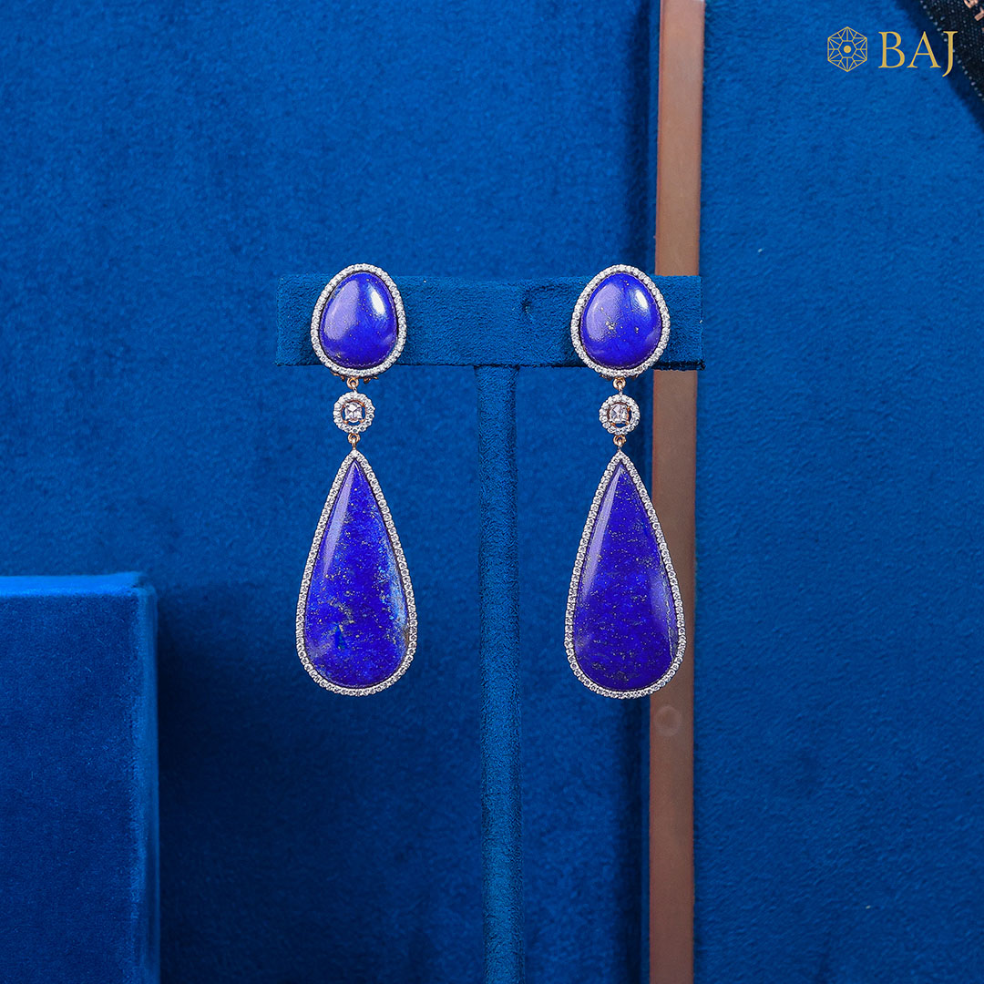 Turn heads with Sapphire Elegance, a bold pair of diamond earrings for women crafted for the Cocktail Wear collection. Featuring deep blue lapis stones accented with 1.74 carats of sparkling diamonds, these 18kt gold teardrop danglers are perfect for glamorous evenings and statement styling. Redefine elegance with this timeless designer pair.