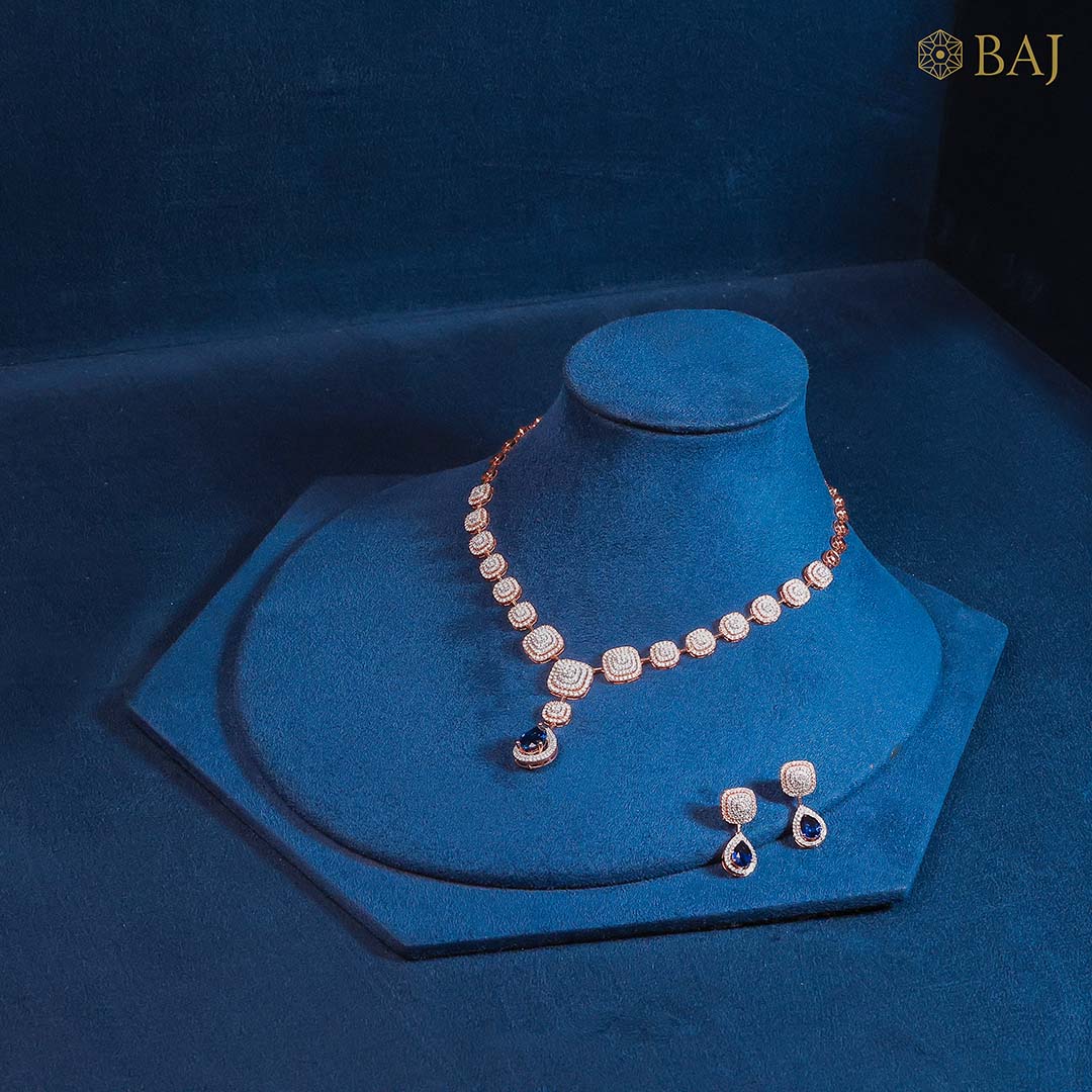 Embrace refined elegance with this diamond necklace set featuring 5.67 carats of diamonds and deep blue sapphire drops. Set in lustrous 18kt gold, this light wear necklace blends classic round motifs with a modern finish—perfect for evening wear and celebratory occasions. A signature diamond necklace set for the graceful woman.