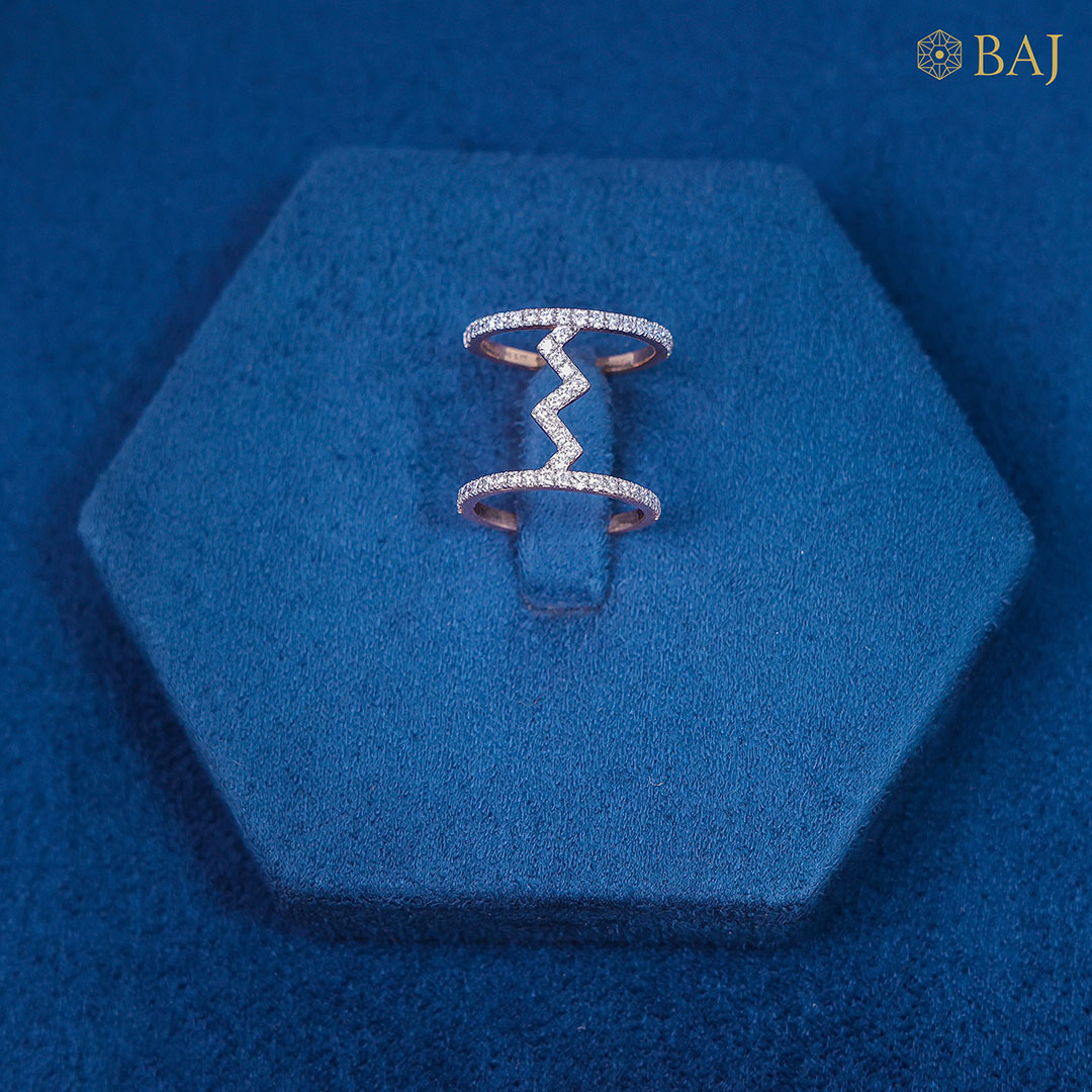 Striking and contemporary, this unique ring features two sleek parallel bands connected by a dynamic zigzag line that runs between them—completely encrusted with dazzling diamonds. The angular design adds an edgy elegance, while the continuous sparkle creates a sense of movement and energy. Crafted with precision and flair, this piece is a modern statement of brilliance and bold style, perfect for those who love jewelry with a twist.