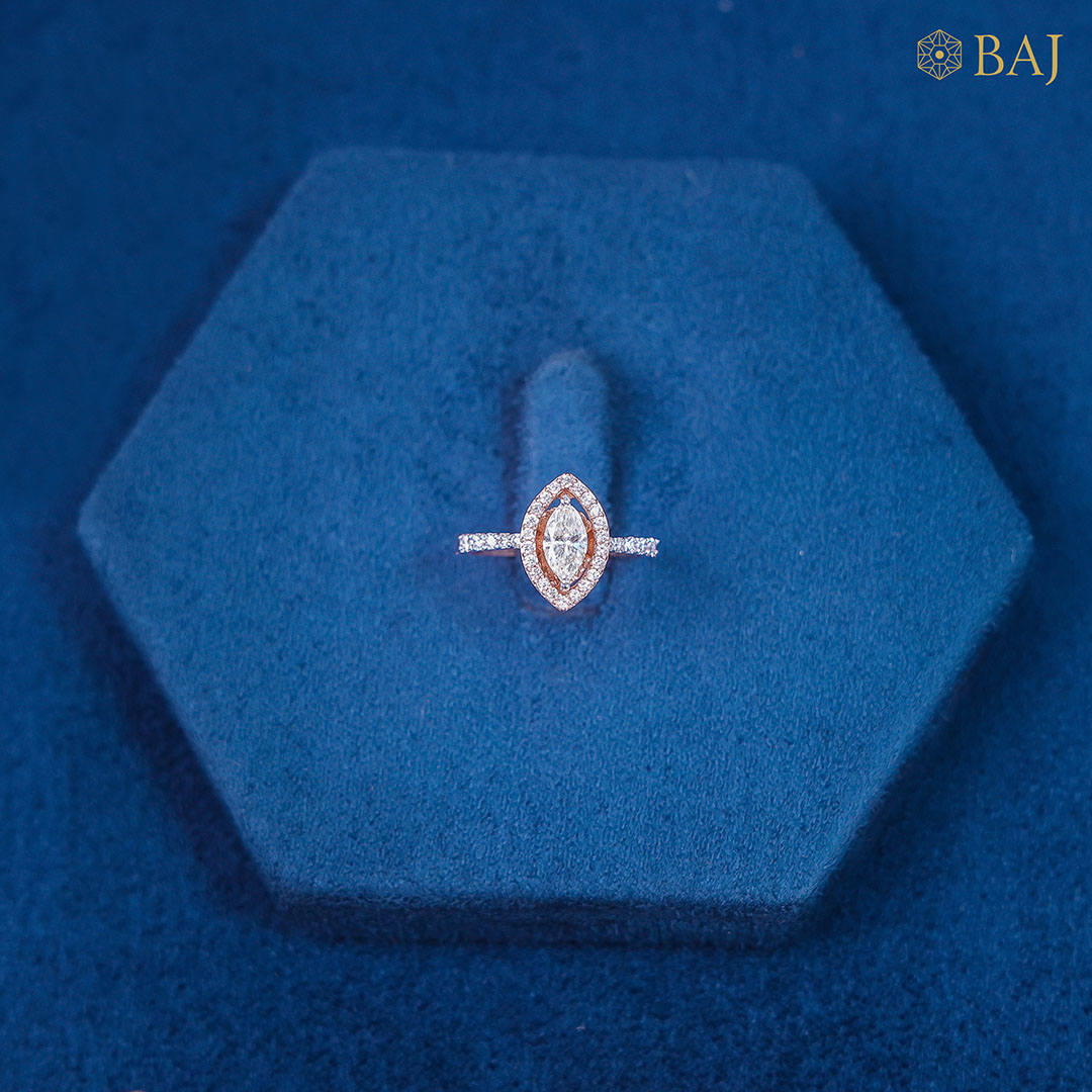 A beautiful single marquise (51 cents) ring in rose gold amidst fine diamonds border. Inspired by the gentle beauty of a blooming flower, this graceful ring features a softly sculpted petal-shaped design that cradles a single, brilliant diamond at its heart. The flowing curves of the petal create an elegant frame, drawing the eye to the center stoneāa symbol of pure love and quiet strength.