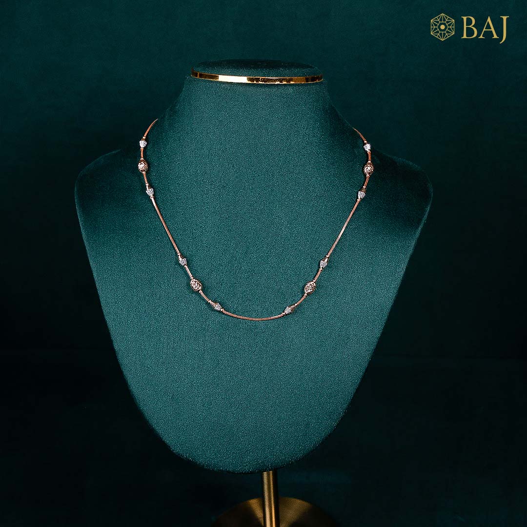 A stunning 18kt gold chain with alternating smooth and textured ball elements, this ladies gold chain is crafted for chic sophistication. Its refined fancy wear design adds flair to daily and festive outfits alike. Lightweight yet eye-catching, it’s the perfect gold chain for women who prefer effortless style.