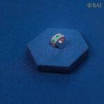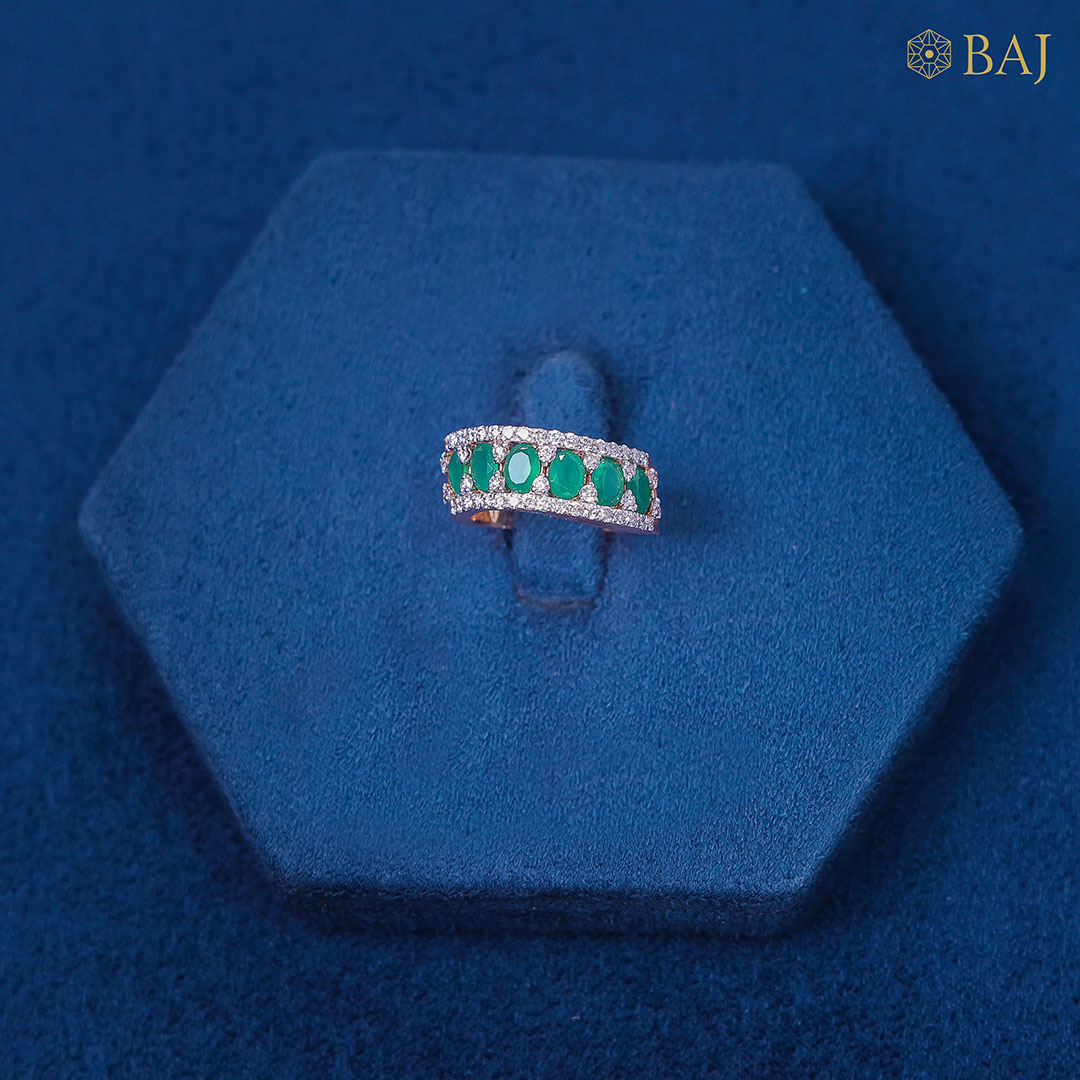 A bold blend of color and brilliance, this exquisite band features a vivid line of emerald gemstones running through the center, symbolizing vitality and timeless beauty. Framing the emeralds, two delicate rows of shimmering white diamonds grace the top and bottom, creating a striking contrast and a perfectly balanced design. ideal for those who love classic elegance with a vibrant twist.