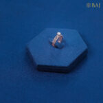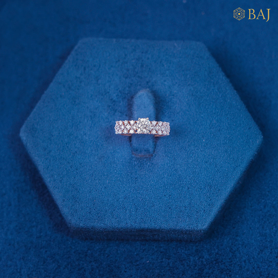 Crafted in warm, glowing rose gold, this elegant band is fully encrusted with sparkling white diamonds that shimmer with every movement. At the center, a brilliant round diamond of 90 cents rises in a graceful pop-up setting, catching the light and drawing the eye with its captivating brilliance.