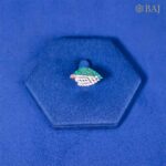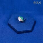 Elegant and eye-catching, this horizontal leaf-shaped ring beautifully captures the harmony of contrast and color. The leaf design is split into two graceful halves—one side adorned with shimmering white diamonds that radiate brilliance, and the other set with rich green stones that evoke the vibrancy of nature. Set in a sleek band, this piece offers a perfect balance of sparkle and serenity, making it a symbol of renewal, growth, and timeless beauty.
